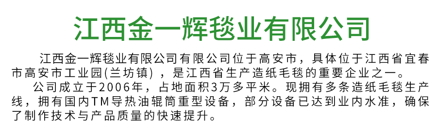 江西金一輝毯業(yè)有限公司位于高安市,具體位于江西省宜春市高安市工業(yè)園(蘭坊鎮(zhèn)) ,是江西省生產(chǎn)造紙毛毯的企業(yè)。